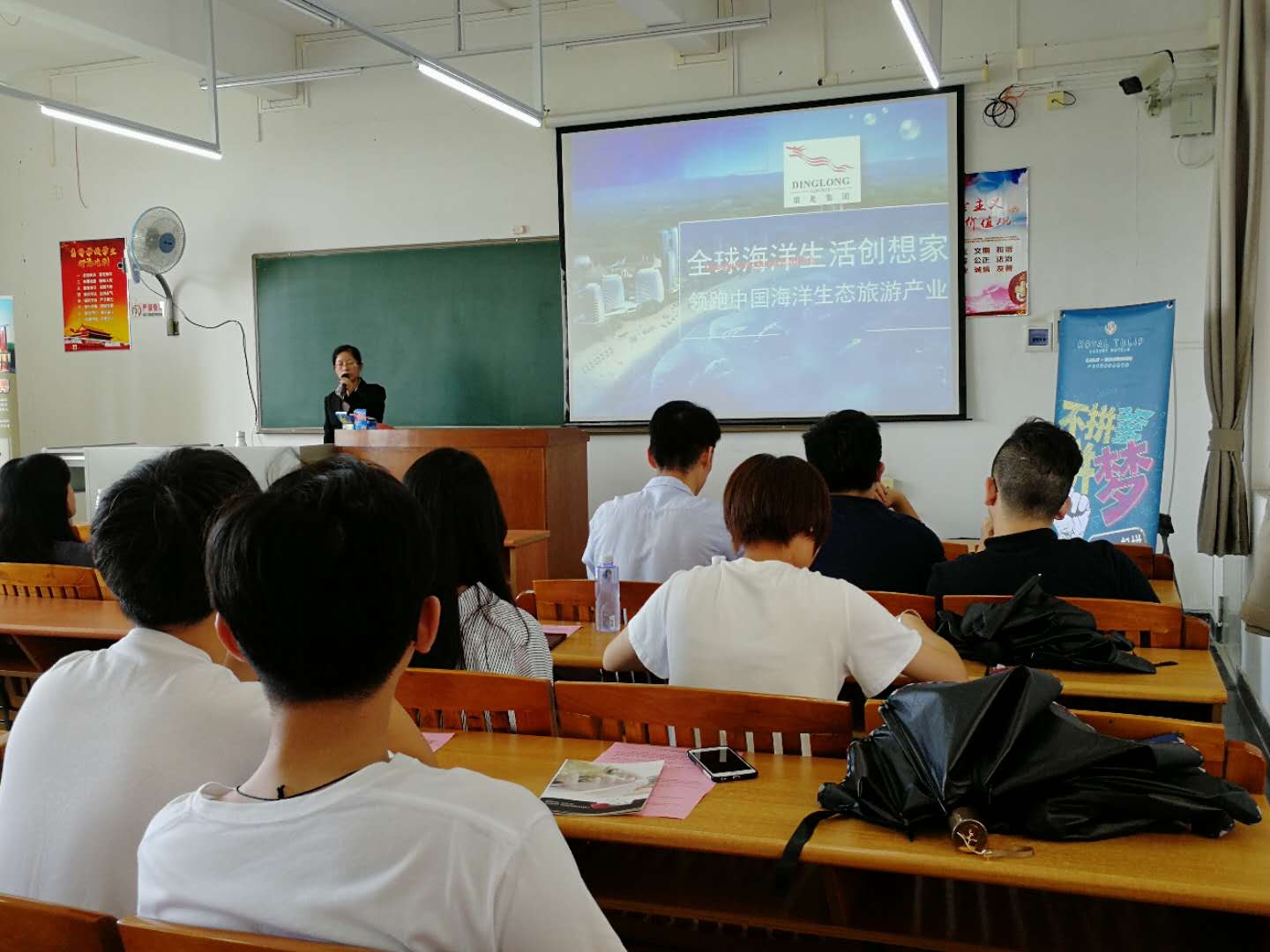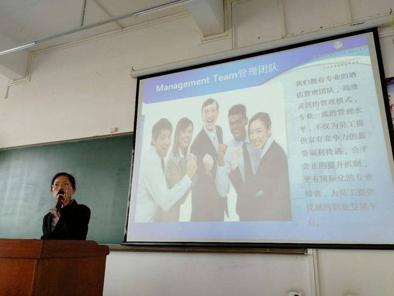 6月4日早上10点,广州卡丽皇家金煦酒店人力资源部总监宣承玉小姐等一行三人来到清远校区实验楼422课室举行宣讲会。旅游管理学院谭金凤副院长、黄隽老师出席了活动,2016级酒店专业学生参与。