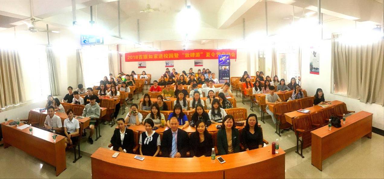 首旅如家2018年进校园活动暨“放肆游”夏令营启动仪式于2018年5月11日14时来到广东南华工商职业学院清远校区,在教学楼419举行。首旅如家酒店集团华南区酒店总经理李艳玲女士担任主持,旅游管理学院胡家夏副院长、熊汝鑫老师出席了活动,酒店管理专业2016级、2017级的全体学生参与。