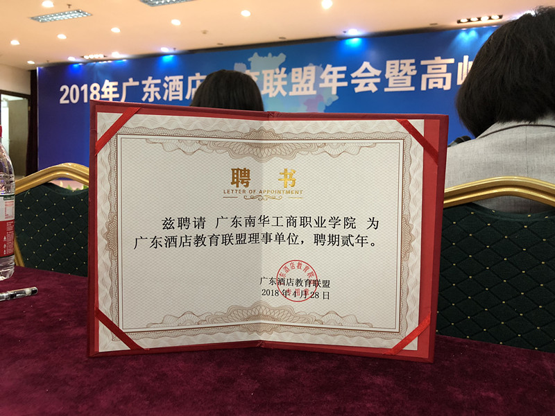 我校在此次培训会上有幸被聘为广东酒店教育联盟理事单位,今后将共同推动广东酒店教育事业的发展,探索校企合作新模式。