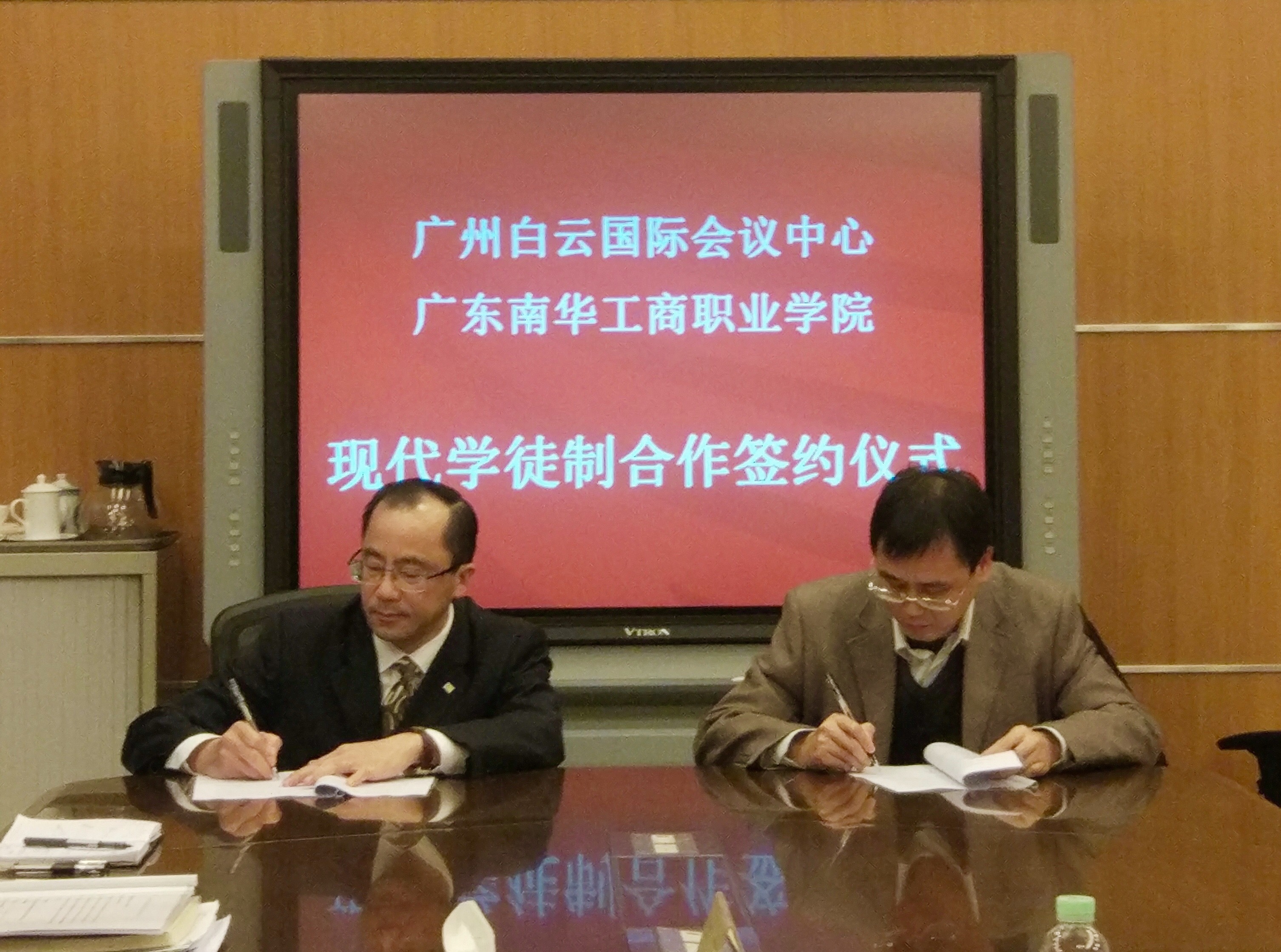 2017年11月24日下午四点四十五分在广州白云国际会议中心,广东南华工商职业学院与广州白云国际会议中心举行现代学徒制合作签署仪式。广州白云国际会议中心总经理雷州先生,会展宴会部总监周凡女士,房务部总监邹倩雅女士,人力资源部经理柴新女士、行政助理郑志工先生、招聘主管曾明先生、人事专员邓秋娣女士和陈静斌先生,以及我校严新副校长,旅游管理系胡家夏主任,学校办公室余柱青副主任,旅游管理系谭金凤副主任和张树清、陈丽芳、王晓强、杨小衡老师出席参加本次仪式。