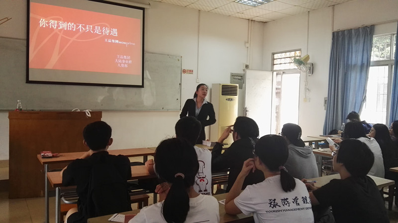 为拓宽就业渠道,方便毕业生选择实习企业,旅游管理系于11月17日下午两点,邀请王品集团在黄埔校区北区8栋102室召开宣讲会。参加此次宣讲会的有王品集团东南区人力资源经理何亚琼女士、广州天河北店长与主厨,以及旅游管理系陈健玲老师和烹饪工艺与营养专业2015级、2016级近200名同学。