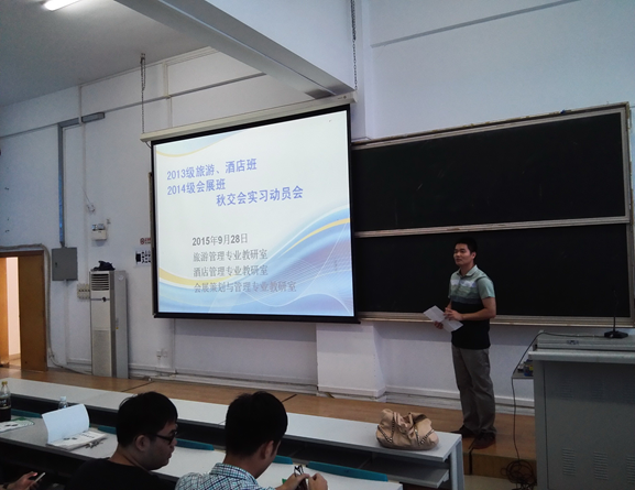 9月28日下午,旅游管理系在黄埔校区南区C203课室隆重举行“2015年秋季广交会顶岗实习动员大会”。旅游管理系酒店管理专业主任陈丽芳老师、旅游管理专业主任梁滔滔老师、会展策划与管理专业张亚红老师以及13级酒店管理、13级旅游管理、14级会展策划与管理共三个专业的全体同学参加了此次实习动员会。