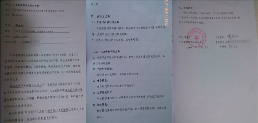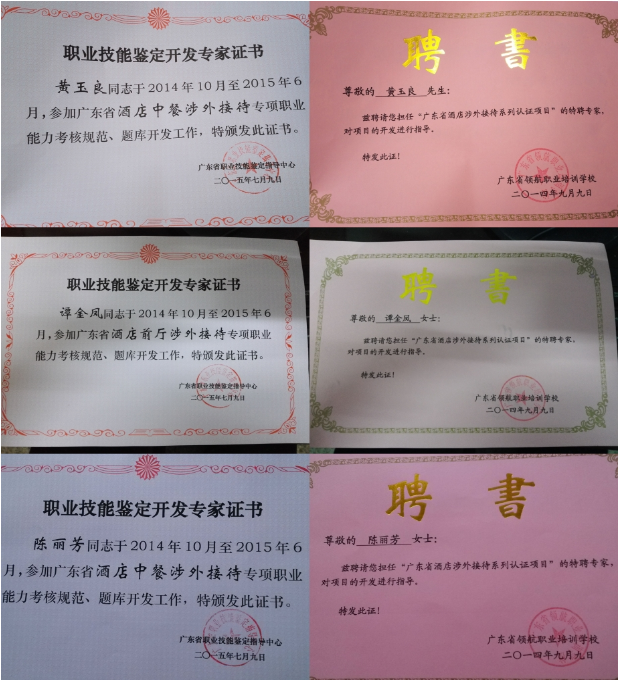 根据协议规定,三位教师依据广东省人力资源和社会保障厅职业研发《专项职业能力鉴定规范制定技术规范》和规范制定方法、命题方法等规定,为酒店涉外接待系列专项职业能力考核规范和卷库提供指导,严格根据考核规范,建设考试大纲和考试卷库,并于2015年6月完成项目任务及通过验收。三位教师同时获得广东省职业技能鉴定指导中心颁发“职业技能鉴定开发专家”证书。这标志着旅游管理系酒店管理专业教学团队的技术服务水平进一步提高,同时,扩大了我系酒店管理专业在业内的影响,为培养酒店管理专业技能复合型人才奠定坚实的基础。