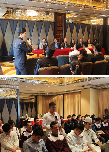 13日上午,校企双方进行深入交流,谢总监代表酒店充分肯定2008年以来双方持续良性合作的效果,对学生的表现整体是满意的,还特意表扬了袁永武同学获得2014年度最佳员工奖(备注:全酒店1000余员工只评定2名),同时喜报南华工商学院的李杏文、龙泽敏、袁永武、卢惠紫、叶惠娟等同学代表酒店参加2014年澳门职业技能比赛,并以优异的成绩赢得最高荣誉“金襟针奖”;校企双方合作硕果累累,学院易江院长就境外酒店行业对专业人才培养的素质及职业要求与酒店方进行了讨论,双方都认同学生的心态培养、优质服务意识、专业素养和英语沟通能力显得尤为重要。