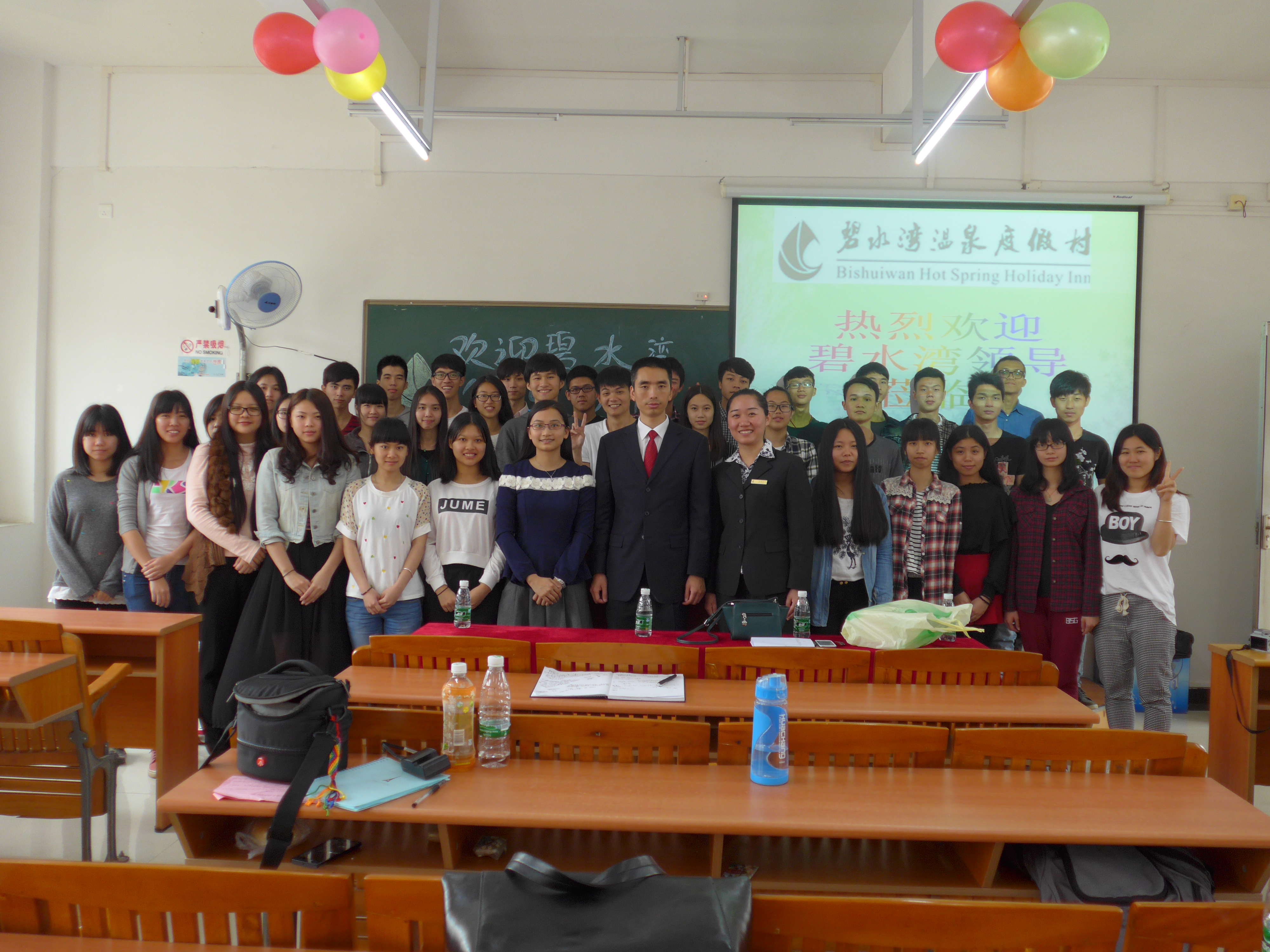 月1日上午,2014级碧水湾班学子怀着激动地心情,热情地在清远校区417课室迎接广州市从化碧水湾温泉度假村董事长助理、人力资源部总监张彦浩和培训师韩翠文老师的到来,现场举行了简单而又隆重的交流会,辅导员马佩佩老师出席了活动,2014级碧水湾班长朱浩文担任主持。