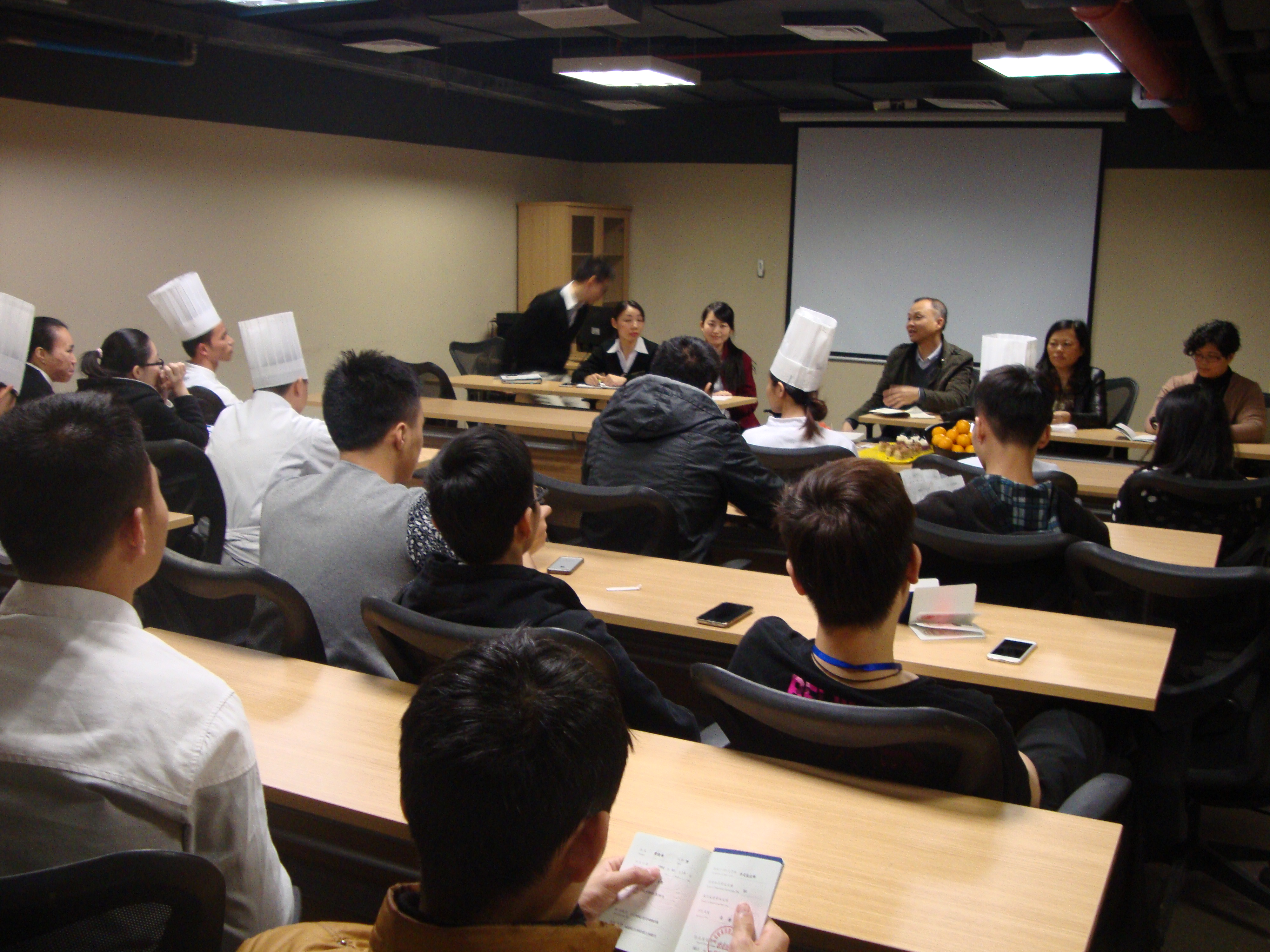 2015年寒假期间,旅游管理系胡家夏主任、谭金凤副主任、烹饪专业教研室主任张树清老师来到了珠海长隆横琴湾酒店。为了不影响企业正常经营运作,同学们挤出午休时间与老师们见面。在座谈会中,同学们汇报了自己的工作,并对厨房同事、工作环境、福利待遇、工作挑战及机遇等方面提出自己的看法,同时更明确了这次顶岗实习的目标。酒店方管理人员高度肯定了同学们的表现,并表示期待同学们毕业时继续留任,为同学们说明了未来的员工职业发展规划。