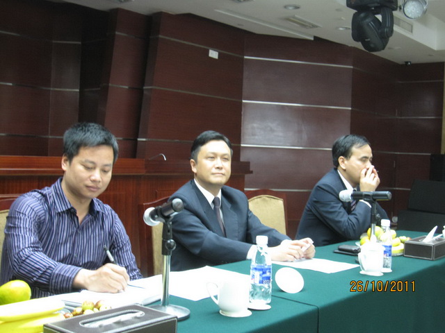 ▲领导认真倾听学生的心声(左至右:招就办黄玉良主任、燕岭大厦田晓波副总经理、张新良总经理助理)