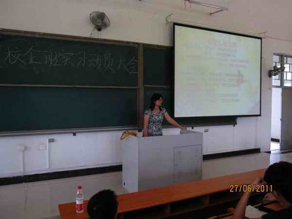 6月27日中午12时30分,2010级校企合作班实习动员大会在我院清远校区教学楼101课室召开。来自不同系别5个校企合作班近250名同学满怀期待,齐聚一堂。旅游管理系邱势老师、方永航老师、陈建玲老师,外语系蔡思杨老师、黄丽莉老师等作为特邀嘉宾出席该大会。动员会由旅游管理系酒店管理教研室谭金凤主任主持。