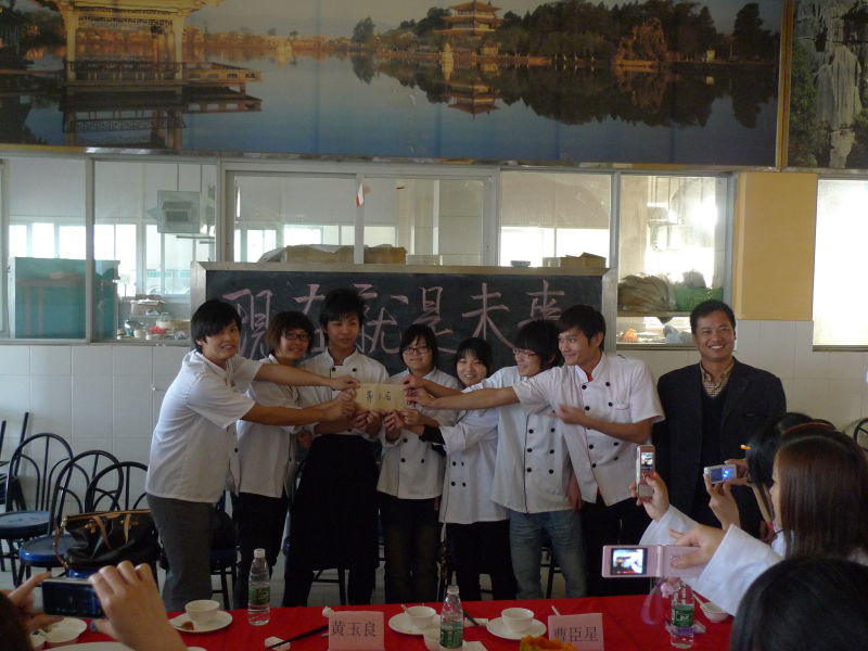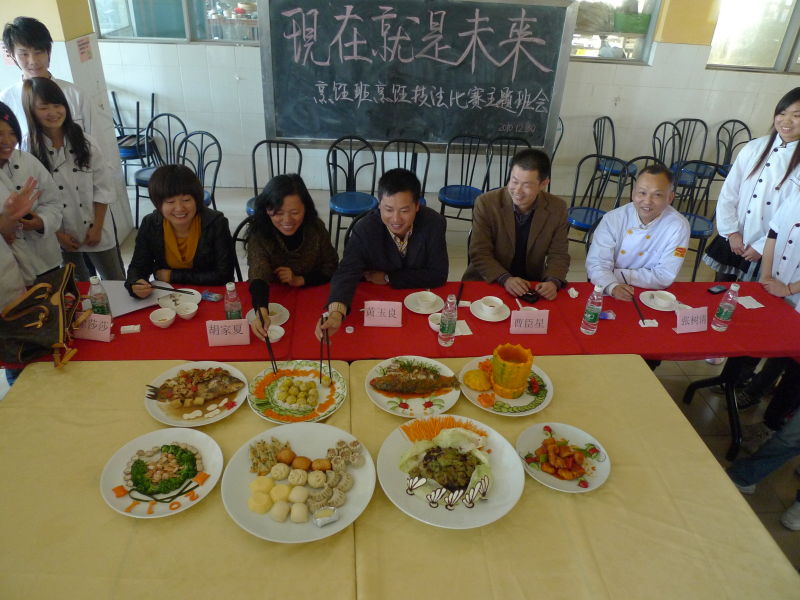 为了体现专业特色,展示同学们的学习情况,本次班会由烹饪工艺与营养专业09级委会策划,全班57名同学踊跃参加,他们分成八个小组,热情高涨,集思广益,各出奇谋。当精心制作的八道菜肴摆在桌上、并由各小组代表介绍菜肴时,得到了受邀出席担任评委的旅游系老师一致好评。黄玉良主任对每道菜都进行了仔细的品评,胡家夏主任则认为本次班会开创了旅游系学生活动的先河,徐莎莎老师对同学们的作品表现了极大的兴趣,曹臣星老师沉浸在同学们的介绍当中,而烹饪老师张树清则在评分纸上不停地记录。