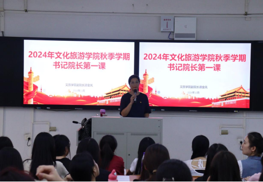2024年10月14日下午,文化旅游学院在一教320教室成功举办2024年度秋季学期书记院长第一课,文化旅游学院副院长谭金凤以“进一步全面深化改革,开辟中国式现代化广阔前景”为主题,宣讲党的二十届三中全会精神。文化旅游学院教师代表、入党积极分子以及23级学生干部共计100余人参加本次活动。