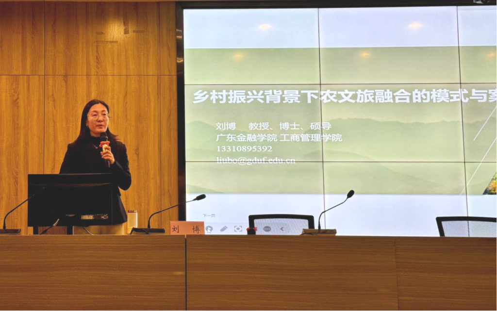 2024年12月9日上午,文化旅游学院成功举办了“领航成长·文旅视界”系列讲座,此次主题聚焦于“乡村振兴背景下农文旅融合的模式与案例”。本次讲座特邀广东金融学院工商管理学院刘博教授主讲,她凭借丰富的学术背景和实践经验,深入剖析当前乡村振兴战略下,农文旅融合的新趋势、新模式及成功案例。