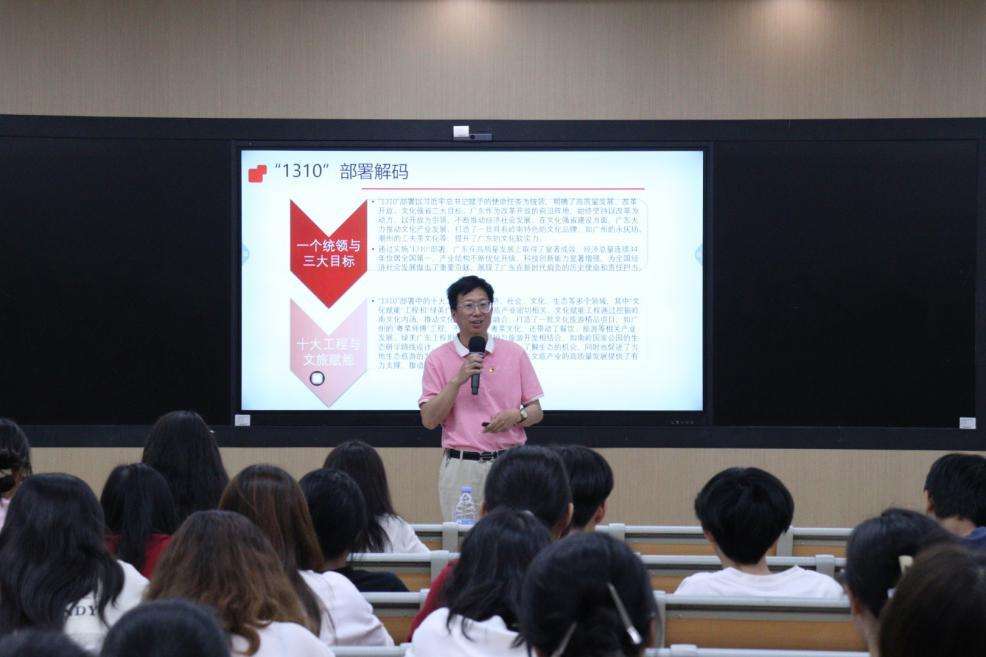 文化旅游学院党总支书记夏建兵以“以青春之力书写中国式现代化的广东答卷”为主题,深入剖析文旅融合赋能高质量发展的实践路径。他聚焦广东文旅创新成果,结合多个生动有力的案例,深入浅出地宣讲省委“1310”具体部署,教育引导学生牢记嘱托、砥砺奋进,积极投身中国式现代化的广东实践。