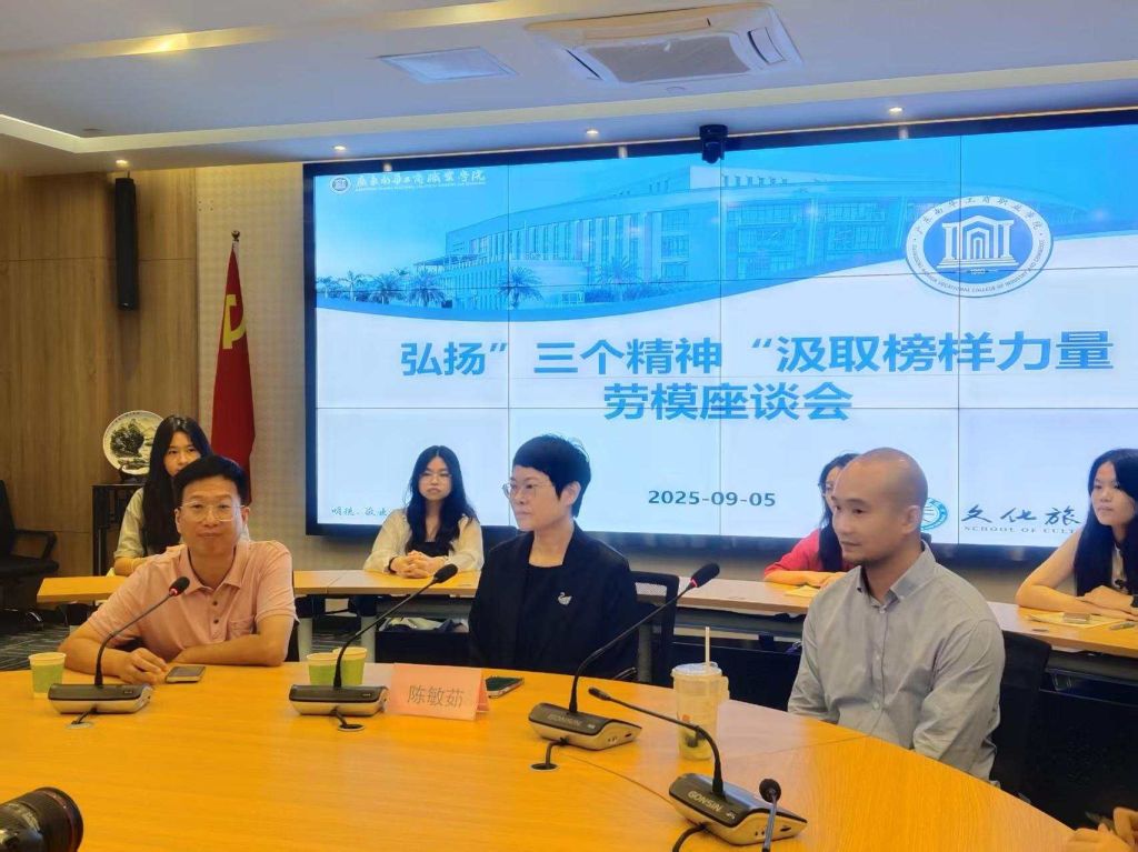 9月10日,文化旅游学院劳模座谈会在图书馆圆桌会议室举行。广东省劳动模范、白天鹅宾馆餐饮部总监陈敏茹,学院党总支书记夏建兵、学工办主任熊汝鑫及24、25级学生参与交流。活动由熊汝鑫主持。