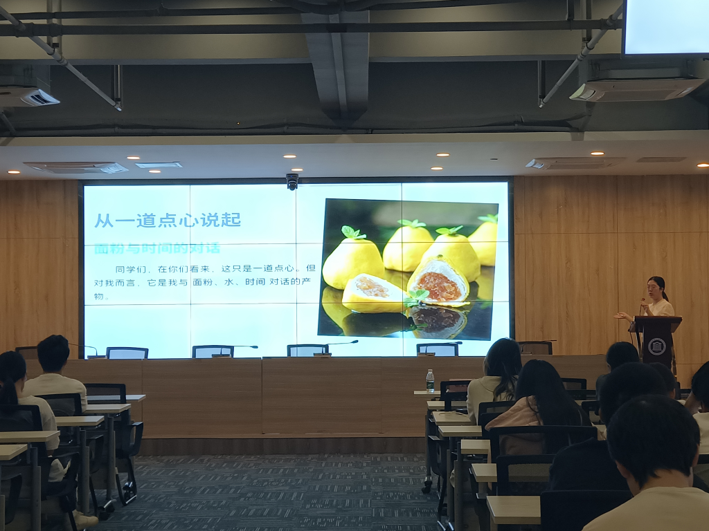 杨文娟以“一道点心”的故事为引,生动讲述面粉与时间的对话,带领师生走进充满温度的美食世界。她阐释,“匠心”不仅是技艺的精湛,更是对坚守、专注与精益求精的内心法则的践行。她指出,从“工”到“匠”的蜕变,是将技术升华为艺术的过程,需要在创意融合、技法创新与文化叙事中持续探索。