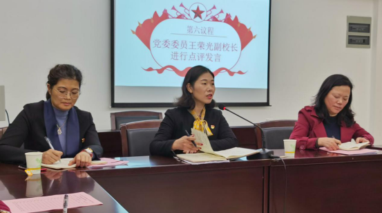 党委委员、副校长王荣光认真听取每个党员发言后,进行点评发言。她肯定了民主生活会前期准备充分,程序完整,发言积极,实事求是;希望同志们把今天取得的成果,贯穿、运用到每个工作环节。在党建工作上,从严从实,抓好问题的整改。民主生活会是党的法宝,在平常的生活学习中,大胆地用,以更好地相互理解、相互提醒,共同进步,有则改之无则加勉,从自己做起,从现在改起。