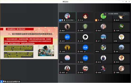 为贯彻《教育部办公厅关于学习宣传和贯彻新修订的职业教育法的通知》《广东省教育厅等十部门关于做好2022年广东省职业教育活动周相关工作的通知》《广东省教育厅关于2022年职业教育活动周有关工作的补充通知》等文件精神,2022年5月26日晚,文化旅游学院通过腾讯会议举行《中华人民共和国职业教育法》学习专题会议。学院全体教师参加此次会议,梁滔滔副院长主持会议。
