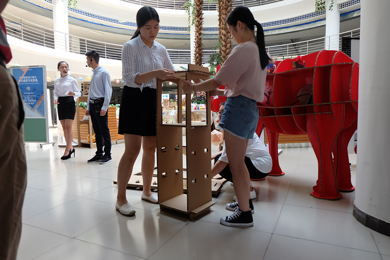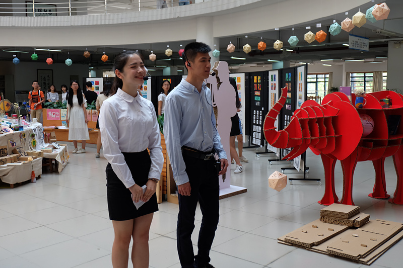 此次展会由两个项目组成,其中“智能环保设计展示”是学院团委组织的“首届学院科技创新节”中由旅游管理系会展专业承办的项目,该活动得到了广州市佳盛文化传播有限公司的大力支持。在项目负责人梁滔滔老师的校企牵动中,我院会展学生在广州市佳盛文化传播有限公司的指导与帮助下,学习使用环保材料“瓦楞纸”,现场搭建节能环保的多样式的展柜。该项目契合“科技创新节”活动的“生产工艺革新和工作流程优化”要求,也代表未来会展业的一种技术趋势。