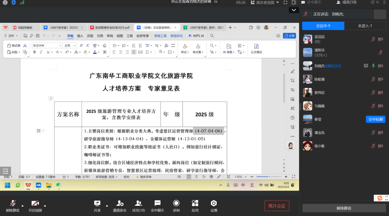 6月9日,文化旅游学院通过线上会议形式组织召开2025级旅游管理、酒店管理与数字化运营、烹饪工艺与营养三个专业的人才培养方案专家论证会。标杆院校相关专业专家、行业企业专家、学院领导及全体专任教师共同参与,围绕方案的科学性、针对性及与行业需求的契合度展开深入研讨。