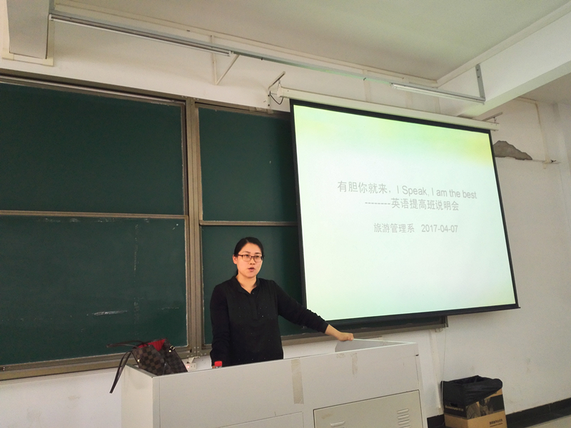随着国际交往也日益增多,英语的使用也愈加频繁,人们对英语的应用能力有了更高的要求,英语水平的高低已成为衡量人们能力的一项重要标准。英语已从单纯交流思想的工具演变为人们获得更多、更好机会的要素,构成现代人才素质的一部分。英语口语水平对于旅游管理系的学生来说显得更为重要,它是学生迈向世界的最重要的交流工具,是促进学生高位就业的重要砝码。为了提高旅游管理系同学英语学习的热情,提升英语口语交流能力,加强学院间的英语学习交流,为同学提供一个可以有效提高英语口语水平的施展平台,旅游管理系举行了英语提高班宣讲会。4月7日下午3点30分,会议由陈丽芳老师主持,旅游管理系谭金凤副主任和本系2015级、2016级酒店管理专业、会展专业、旅游管理专业、烹饪工艺与营养专业近一百三十名学生参加了此次宣讲会。