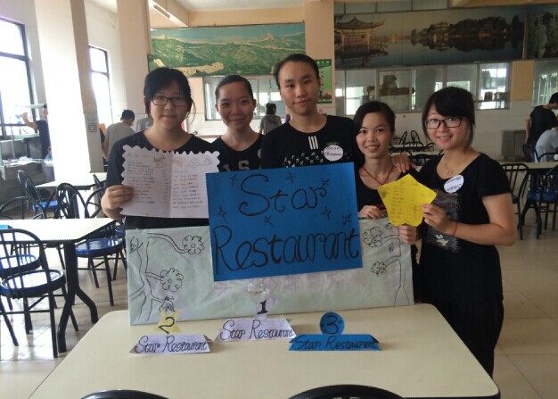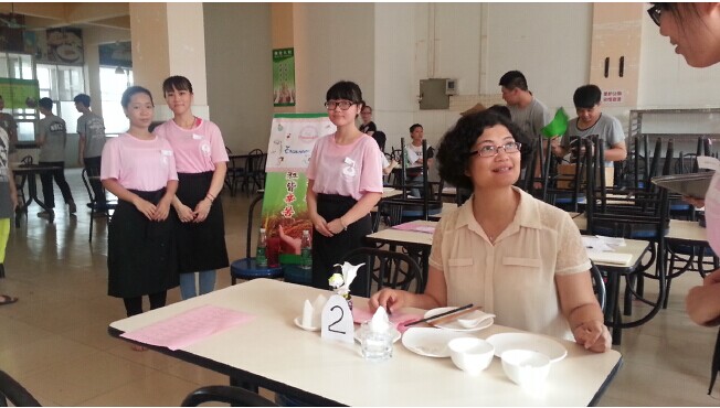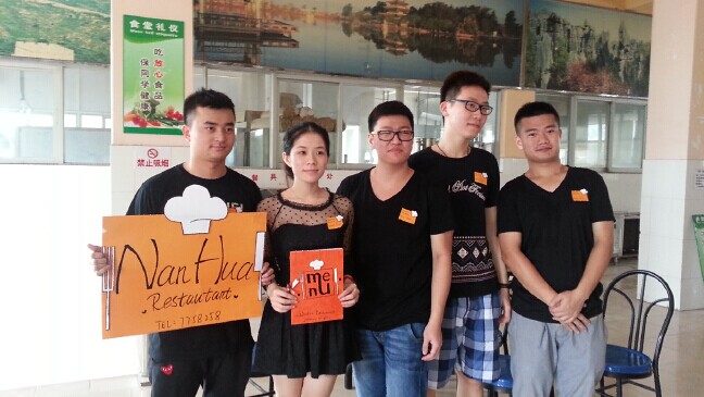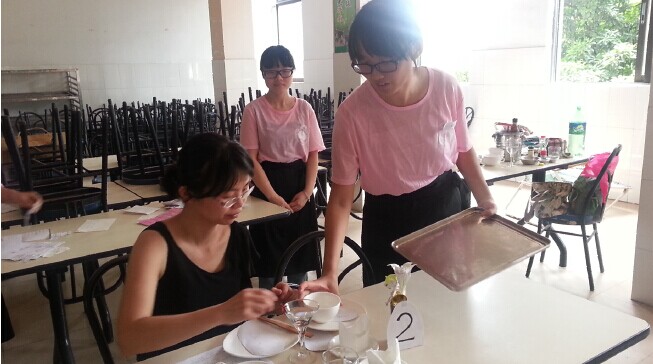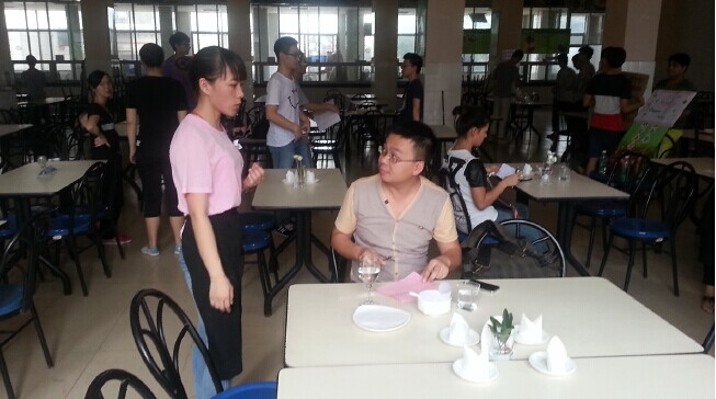 6月16日,12烹饪班在黄埔校区的饭堂二楼进行了餐厅实训和考核。实训的队伍是全班的8个组,每个组对自家餐厅包括摆设、招牌、菜单、餐厅服务员着装等都进行精心的设计。本次实训有幸邀请了既精通餐厅操作,又精通外语交际的旅游管理系副主任谭金凤和旅游管理系应用英语教研室主任邱势两位老师以及9位专业知识扎实、英语口语交际能力比较好的同学作为餐厅的客人和评委。当餐厅的客人走过的时候,各个餐厅都非常热情地招揽客人,并热情地用英语服务,让学生在真实的工作环境中应用英语,考核了学生包括英语、礼仪、工作操作规范等方面的综合能力。