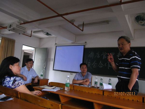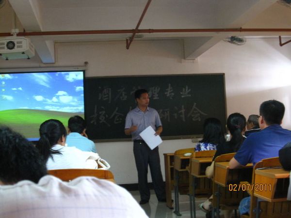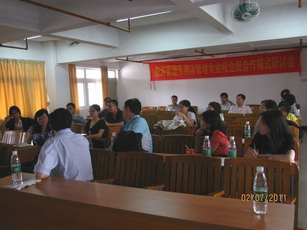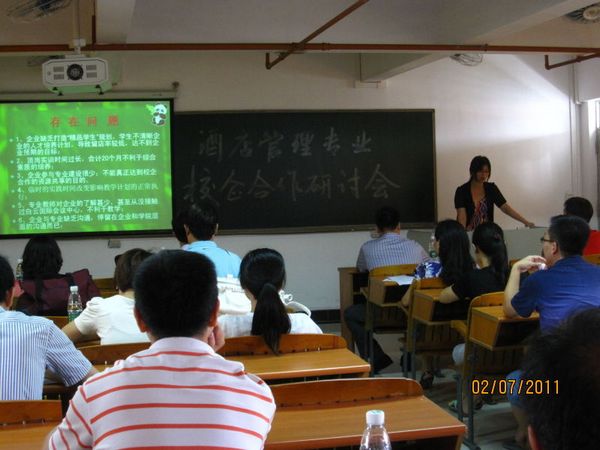 7月2日上午,酝酿已久的酒店管理专业校企合作班人才培养模式研讨会在天河校区综合楼804室举行。张诗哲副院长、招生就业办王满元主任、教务处韦秀华处长百忙中抽空出席了本次会议,与会的还有旅游管理系全体教师。研讨会由旅游管理系黄玉良主任主持。首先,由酒店管理教研室谭金凤主任汇报了旅游管理系2008级“白云班”整体教学情况。谭主任从校企合作模式的优势、学生的收获、存在问题三方面进行了全面透彻的分析。事实充分证明校企合作培养模式达到了学生、企业、学校“三赢”效果。针对存在问题,谭主任建议企业方能规划打造“精品学生”,多参与专业建设并相应减少学生顶岗实训时间;学校及系加强学生实习期间的管理及信息沟通。同时强烈建议学院加强对校企合作班的重视与宣传,最好能设立专门的校企合作班管理部门,避免多头沟通及信息不对称。此外,结合已有经验及存在问题对今后校企合作班的教学作了详尽可行的规划。