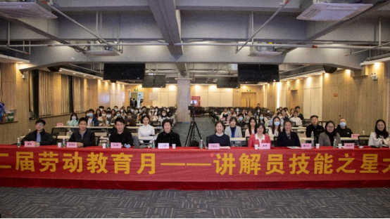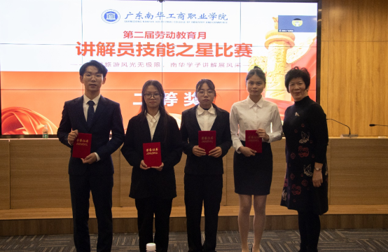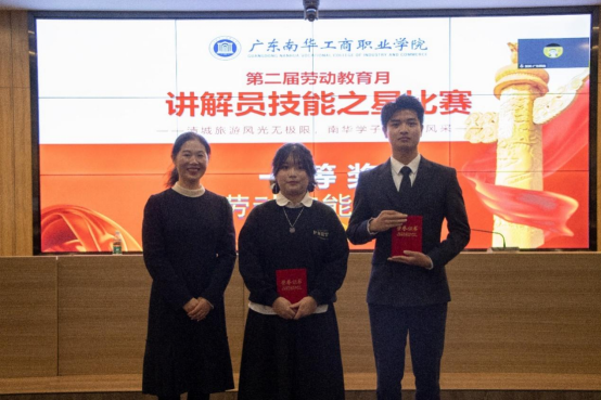 2022年12月2日晚,由劳动关系与工会理论研究院主办,文化旅游学院、清城区文化旅游产业学院承办的“第二届劳动教育月——讲解员技能之星比赛”在清远校区图书馆多媒体报告厅圆满落下帷幕。广东南华工商职业学院副校长王荣光、劳动关系与工会理论研究院院长周芳、文化旅游学院副院长谭金凤等领导出席比赛现场。清远市旅游协会秘书长张秀莲、副秘书长陈峰,广东机电职业技术学院旅游学院院长王宁(线上),中国国旅(广东)国际旅行社股份有限公司党委书记、副总经理(主持工作)张岩(线上),清远市银盏温泉开发有限责任公司董事总经理林新松(线上),文化旅游学院副院长梁滔滔、旅游管理专业负责人刘又榕、专任教师郭伟欣通过“线上+线下”形式担任评委。校内外师生、企业专家超200人次观摩了决赛。