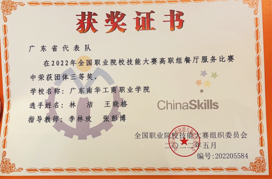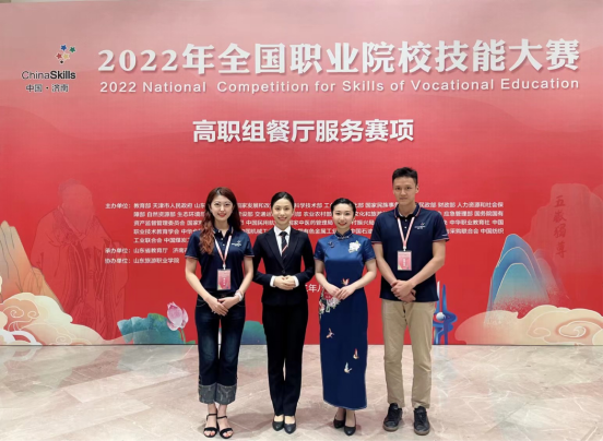2022年8月28日-9月1日,2022年全国职业院校技能大赛高职组餐厅服务赛项在山东旅游职业学院拉开帷幕。该赛项由山东省教育厅、济南市人民政府、山东省文化和旅游厅共同承办,山东旅游职业学院协办。来自全国57支省代表队共114名技能精英云集赛场、尽展风采。我校文化旅游学院酒店管理与数字化运营专业负责人李林玫和专任教师张彭博携2019级酒店管理班学生林洁、王晓格组成的广东省代表队参加此次大赛,取得国赛三等奖的佳绩。
