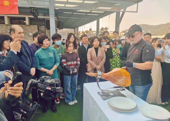 图八 广州火腿先生工作室创始人总经理王亚非展示西班牙火腿切割