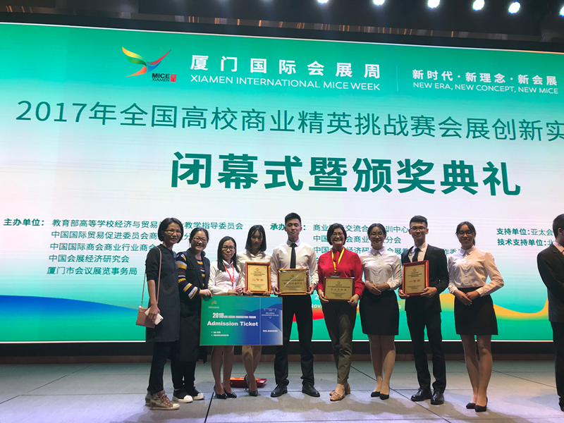 2017年11月7日至10日,由教育部高等学校经济与贸易类专业教学指导委员会、中国贸促会商业行业分会、中国国际商会商业行业商会、中国会展经济研究会、厦门市会议展览事务局共同主办的2017年全国高校商业精英挑战赛会展创新实践竞赛全国总决赛(以下简称“总决赛”)在福建省厦门市成功举办。本次竞赛初赛阶段共吸引了全国103所高校236支队伍近5000名师生报名参加。经院校推荐选拔、组委会评审,最终来自全国26个省市、自治区、直辖市78所高校155支参赛队伍入围此次全国总决赛。我校旅游管理系副主任谭金凤老师、会展策划与管理专业陈屹珊老师和刘淑惠老师,带领两支专业学生队伍,参加全国高校商业精英挑战赛会展创新实践竞赛的激烈角逐。其中16级学生陈炜煌、陈祯奕、罗珍好的作品《2019年中国(深圳)嘻哈潮流文化展览会》斩获一等奖,15级学生吴海怡、黎铝桃、刘格良的作品《2019年国际(广州)民宿产业博览会》荣获二等奖。广东南华工商职业学院荣获最佳组织院校奖和最突出贡献奖,陈屹珊、刘淑惠老师获得优秀指导教师奖。