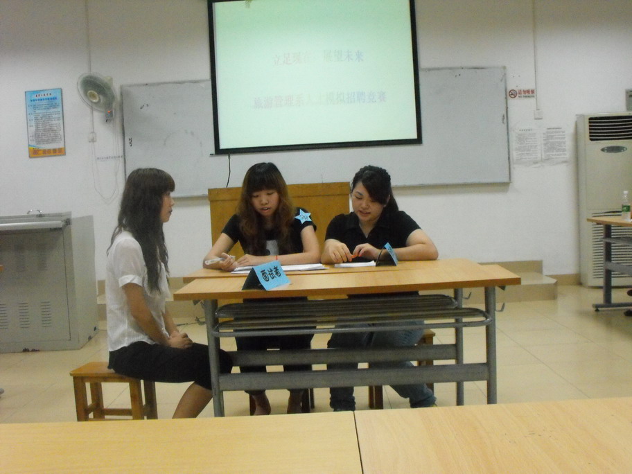 6月2日晚上6:30, 旅游管理系首届模拟面试大赛在北区7栋102拉开帷幕。担任本次大赛的企业方评委是广州中船黄埔造船有限公司人力资源部招聘主管熊春霞女士及某培训公司经理陈志坚先生,校方评委为马远、陈晓敏、梁滔滔和李宾等专业教师。模拟面试以贴近实际、锻炼能力为目的,取得了圆满成功。