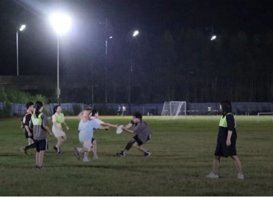 活动还设有飞盘比赛,同学们秉承“盘不落地,永不放弃”的信念不断传递着飞盘,不放弃每一次抓住飞盘的机会。狭路相逢勇者胜,参赛选手斗志昂扬,队伍之间的飞盘传递十分默契、完美配合,上演着技巧与体能之间的较量,比赛高潮迭起,现场欢呼声此起彼伏。同学们通过参与飞盘运动,展现了拼搏奋斗的精神,面对困难不轻言放弃,努力争取来实现目标。