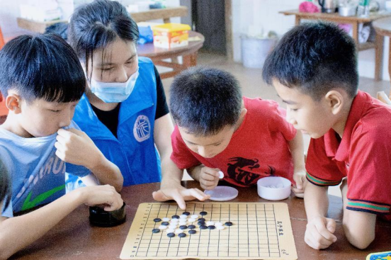 当天14时30分,“彩虹阶梯”社会服务团队成员为孩子们开展了棋类益智游戏的相关学习课程。课堂上,成员们仔细介绍了五子棋和飞行棋的步骤和规则,激发起孩子们对益智游戏的兴趣,并带领进行下棋学习。学习棋类益智游戏可以为孩子们养成静心思考的好习惯,同时促进逻辑思维能力、智力的开发。