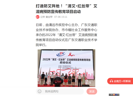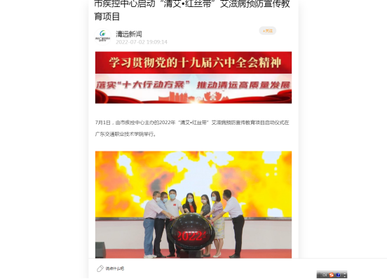 本次“清艾·红丝带”艾滋病预防宣传教育项目启动仪式受到了多家媒体的关注,南方日报、清远市电视台等都对本次活动进行了报道。