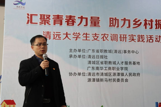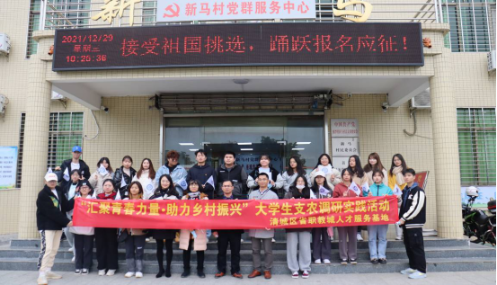 为贯彻广东省委组织部、广东省人社厅等部门联合印发《广东省2021年高校毕业生“三支一扶”计划实施工作方案》,引导青年学生培育和践行社会主义核心价值观,坚持“受教育、长才干、作贡献”的宗旨,同时为落实清远市委“十大行动方案”,2021年12月29日,由广东省职教城(清远)事务中心主办,清远日报、清城区省职教城人才服务基地、广东南华工商职业学院联合承办的“汇聚青春力量,助力乡村振兴”清远大学生支农调研实践活动在清远市清城区源潭镇新马村拉开帷幕。文化旅游学院旅游管理专业负责人刘又榕、辅导员柯沛葱以及若干文旅学子参加了本次调研实践活动。
