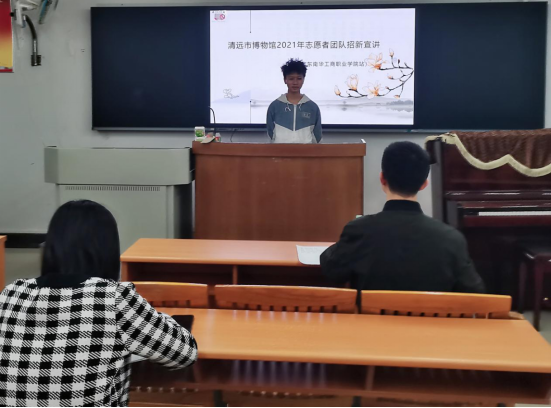 为更好地向公众展示清远市悠久的历史文化,给喜爱文博、热心公益的同学提供一个实现社会价值和人生价值的平台,清远市博物馆到我校进行志愿者招募和培训。活动于2021年10月21日、22日晚在清远校区教学楼108课室进行。