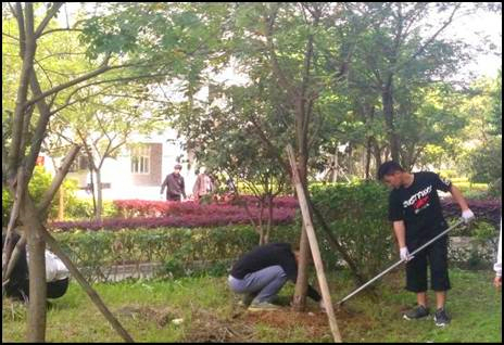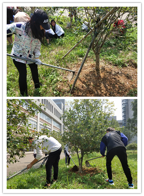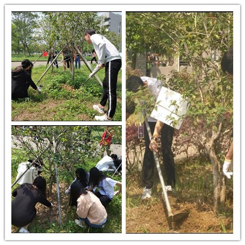 2018年3月23日下午一点,旅游管理学院组织同学们在教学楼集合,提前准备好化肥、水桶、锄头等工具材料。护理的树苗主要是在教学楼、实验楼和宿舍区绿化带中,旅游管理学院历届学生捐赠、栽种的桂花树。