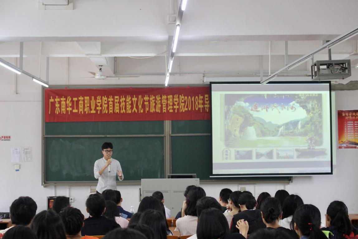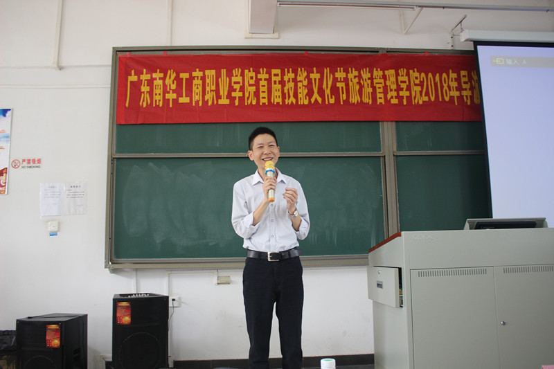 为提高学生专业技能,营造活跃的校园文化氛围,旅游管理学院于4月27日上午在清远校区教学楼419课室,举办了我校首届技能文化节之导游技能大赛(半决赛)。清远市导游协会副会长兼秘书长张勇、我院旅游管理系主任梁滔滔、旅游管理专业负责人郭伟欣、专任教师潘新洁出席此次活动并担任评委。