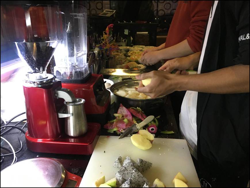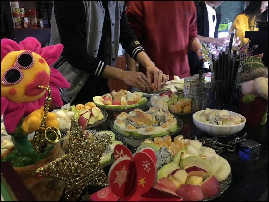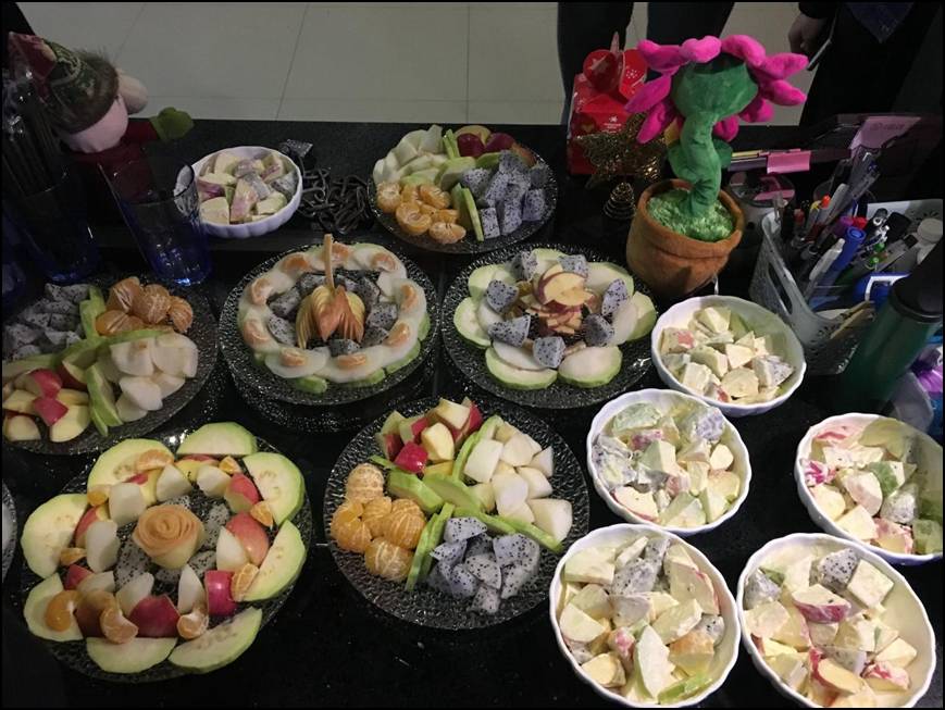优美的旋律在大厅回荡,现场人气满满。17级烹调班同学现场制作了水果沙拉,给同学们送去温馨的祝福。