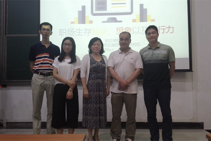 在职场生存部分,刘总讲了四要诀,其一:端着铁饭碗去跳槽,收起个性,谦虚“待业”;其二:不要让无聊资讯吃掉你的青春;其三:干得好不妨碍嫁得好;其四:巧妙克服“心理罢工”。而后,刘先生通过自己的创意工作经历,给予同学们三点建议:1、换位思考,无论在工作还是在生活中,换位思考可以让自己体谅到别人的情况;2、多参加集体活动,出到社会,每一家企业都是以团体合作的去完成工作,如果不和其他人交流,你就无法融入这个集体;3、用平常心面对挫折,在工作上我们会遇到许许多多的挫折,不少人选择了放弃,只要我们用平常心来面对,一切挫折都会变为我们前进的垫脚石。最后,只有挖掘和展开自己的想象力,才能更好地完成创新。随后,身为桃花湖旅行创始人兼CEO,刘先生介绍了桃花湖旅行的梦想与实践,通过影片介绍以及合作伙伴的介绍,让同学们了解到桃花湖的迷人色彩,同时,利用他的职业生涯的经验,轻松回答了现场学生们的“烧脑”问题。