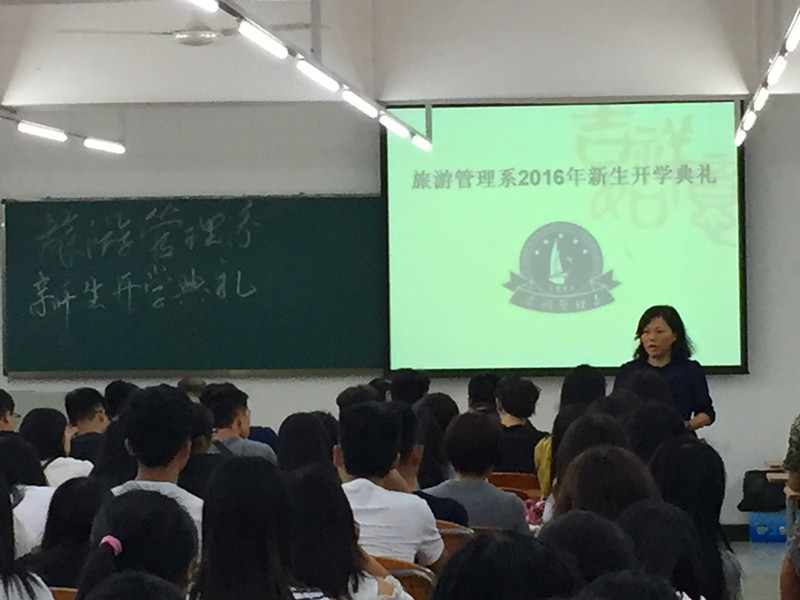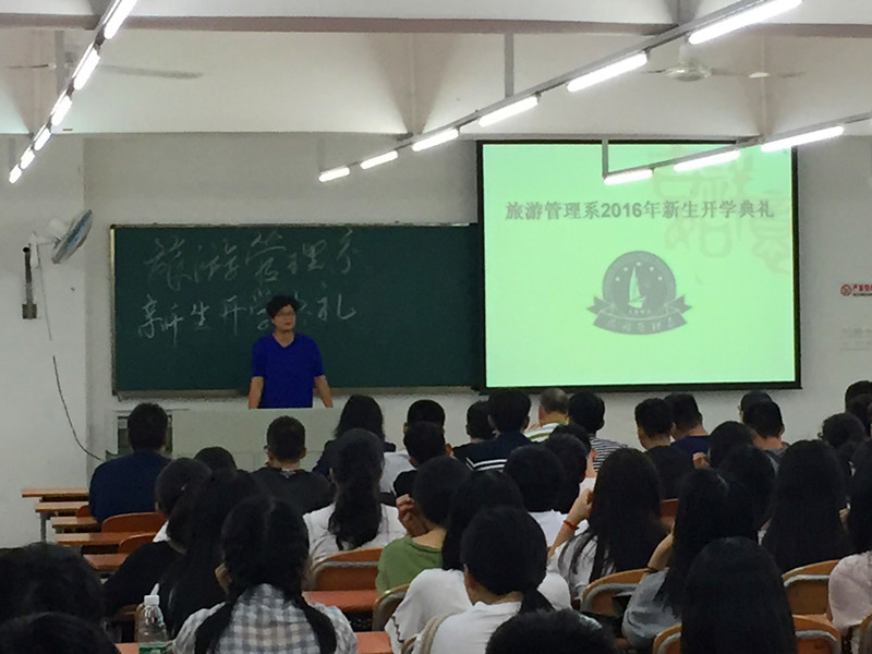 为了让2016级新生能尽快投入大学生活,了解专业发展,把握自身成长,旅游管理系于9月3日晚7点,在清远校区实验楼316课室举行了简单而隆重的旅游管理系2016新生开学典礼。旅游管理系胡家夏主任、谭金凤副主任、旅游管理专业教研室主任梁滔滔老师、酒店管理专业教研室主任陈丽芳老师、烹饪工艺与营养专业教研室张树清老师、郭伟欣老师、杨小衡老师、熊汝鑫老师出席活动,黄隽老师担任主持,2016级300多名新生。