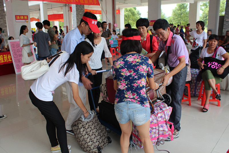 辅导员马佩佩老师、黄隽老师带领团总支学生会干部以及志愿者一早就到场工作。接待组,注册组,后勤组,咨询组等学生职能部门,分工明确各司其职,带着满腔热情迎接新生。作为师兄师姐,2013级学生干部经过一年的学习和实习工作,更加懂得乐于助人的深刻道理,所以能以贴心的服务迎接师弟师妹的到来。从校门的举牌引导,到系里大本营的真诚接待;从细致地登记新生们的个人信息,到搬运行李、指引到宿舍,所有的新生都享受到了他们师兄师姐们提供的微笑服务,充分感受到旅游系的热情和温馨。13-14日接连两天的迎新工作,忙碌而奔波,却并没有消耗大家的热情和动力,依旧以饱满的精神状态,为新生提供周到的服务。