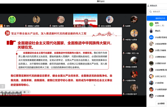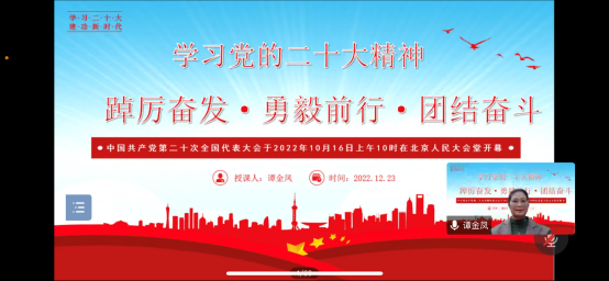 日19时,文化旅游学院党支部12月主题党日活动顺利举行,由文化旅游学院党支部书记谭金凤以“踔厉奋发,勇毅前行,团结奋斗”为题作主题党课讲授。学院全体党员教师、20级预备党员、