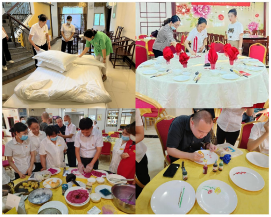 随后,各支部党员实地参观了银盏温泉宾馆公司各经营板块,感受银盏温泉得天独厚的森林园区资源,同时体会到银盏温泉党支部在多年企业发展中面对困境毫不退缩。新冠疫情发生以来,银盏温泉积极生产自救,带领职工自力更生,不断完善露天区的服务产品、登山栈道和帐篷营地等,在不断发展提升的征途中发挥出战斗堡垒作用和先锋模范作用。在后续召开的座谈会上,文化旅游学院教师对银盏温泉宾馆的建设给予充分的肯定,并通过参观交流对企业各业务板块的产品、宣传、服务提升给出中肯专业的建议,同时开展“支部送教到企活动”,在中餐宴会摆台、面点制作、果酱画、客房服务等方面给企业员工开展技能培训活动,促进了企业从业人员业务质量的提升。在场的党员、职工纷纷表示受益匪浅。