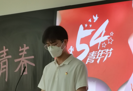 砌五四,立足当下,“百年未有之大变局”波澜壮阔。通过观看学生、医护人员、奥运健儿、边防战士等人的事迹,了解何为青年。视频中习近平总书记强调:新时代中国青年要以实现中华民族的伟大复兴为己任。刘帅波、王雨同学朗诵《红色》。入团积极分子余庆城围绕青年人要明确目标,敢于最求梦想,努力奋斗进行演讲:我们正处在国泰民安大有可为的时代,面对星辰大海之征途,肩负振兴中华使命,吾辈青年更将有“泰山崩于前而面不改色”的勇敢无畏精神。点燃心中无限燥火,照亮人生灿烂前途。