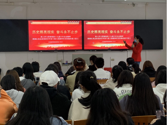 谭金凤书记分别从四大阶段成就、五大历史意义、十个坚持、十三方面历史性成就等方面,让学生充分解了十九大六中全会公报的内容,明白了中国共产党奋斗百年的艰辛与不易。历史照亮现实,奋斗永不止步,中国共产党始终站在人民的角度,为人民谋幸福,为民族谋复兴。
