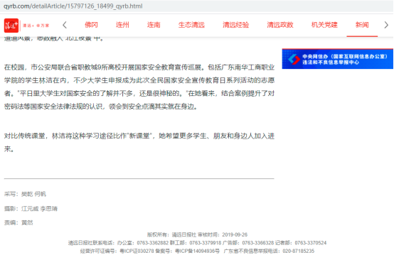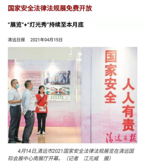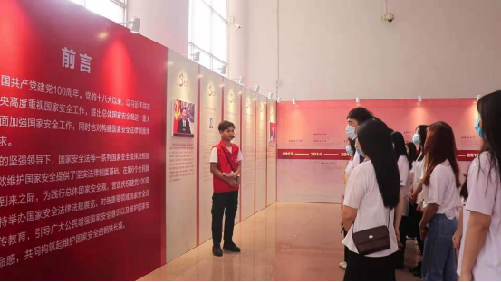 2021年4月12-25日,由文旅学院入党积极分子和入党申请人组建的志愿讲解队伍,在清远国际会展中心作为讲解员参与清远市2021国家安全法律法规展览。本次展览集“公众宣传、全民教育、现场体验”为一体,旨在推动清远市全民国家安全教育日活动深入开展。展览以"国家安全在身边"为主题,以丰富的图片、案例,阐述了总体国家安全观的历史背景、重大意义和内涵外延;系统梳理了国家安全法律法规体系,引导全社会动员起来,共同筑牢维护国家安全的人民防线。活动受到了清远日报、清远广播电视台等媒体的报道。