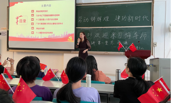 为深入贯彻习近平新时代中国特色社会主义思想,传达学习2021年全国“两会”精神,推动学院党史学习教育工作走深走实,3月30日,文化旅游学院“劳动铸辉煌,建功新时代”专题讲座在黄埔校区203会议室召开,讲座邀请全国人大代表、省五一劳动奖章获得者米雪梅为烹调工艺与营养专业2019级学生进行“两会”精神宣讲。文化旅游学院副院长胡家夏、谭金凤,烹调工艺与营养专业负责人张树清,辅导员熊汝鑫、刘晓欢参与了讲座。
