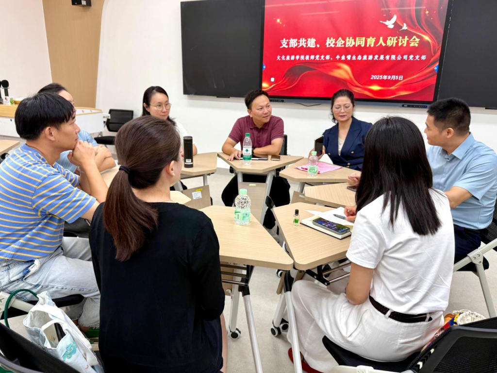 为深入学习贯彻习近平总书记关于职业教育与文旅融合发展的重要指示精神,落实省委关于“百县千镇万村高质量发展工程”的部署要求,9月4日上午,文化旅游学院教师党支部与清远市牛鱼嘴生态旅游发展有限公司党支部联合召开校企共建交流会。会议以“党建引领、产教融合、服务地方”为主题,聚焦文旅人才培养与区域经济协同发展,推动党建与业务双融双促。