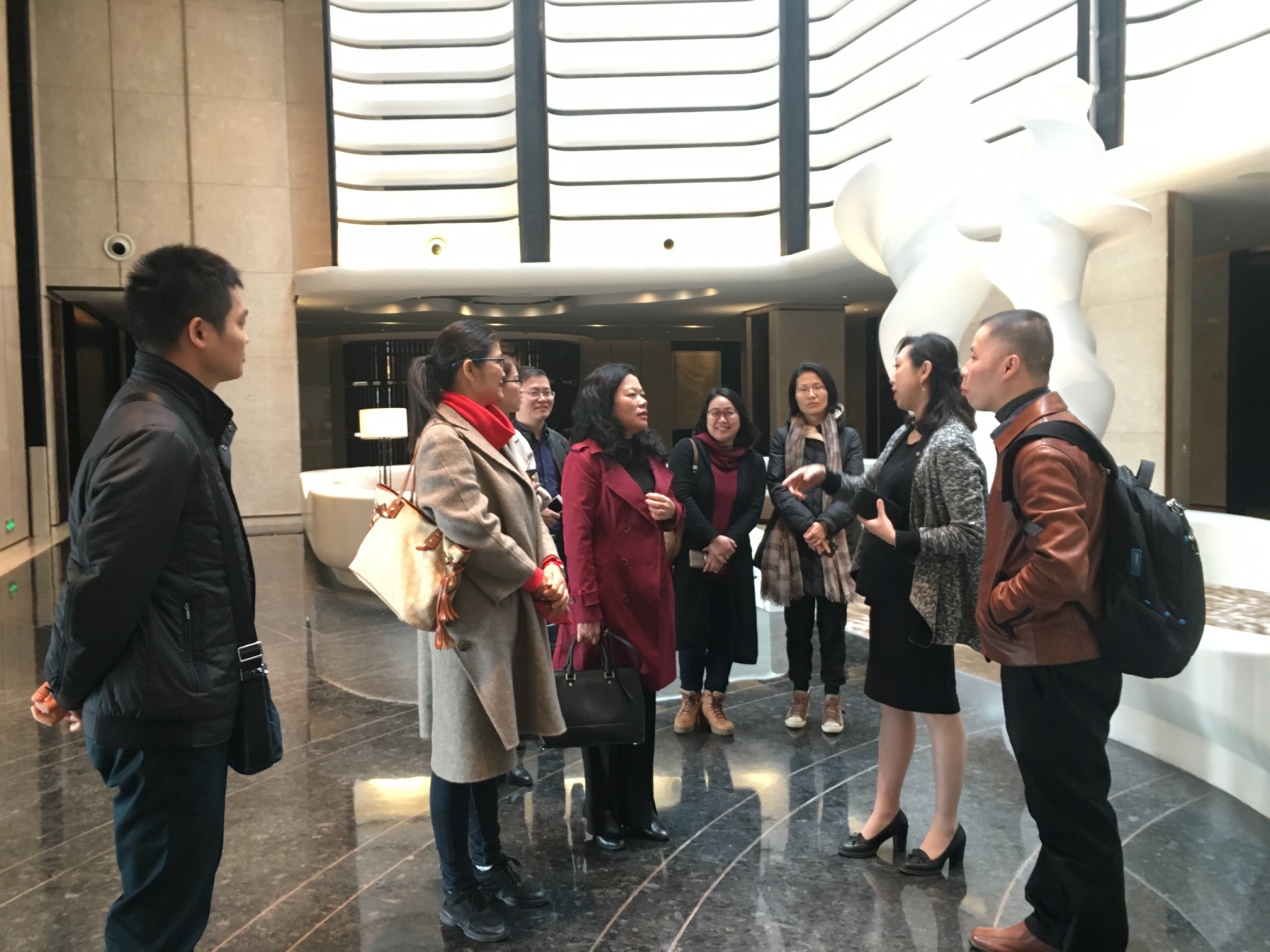 尔后,在屠总和阮经理的带领下,旅游管理学院教师参观了两家典型国际奢华酒店。第一站是南京圣和府邸豪华精选酒店(The Grand Mansion, a Luxury Collection Hotel, Nanjing),南京圣和投资集团有限公司总裁助理杨会接待我院一行参观了酒店的前厅、客房、餐厅、康乐等部门。酒店设计精致低调,装潢极具奢华美感和现代感,呈现出设计师的独特眼光,为客人创造出别具一格的体验。最后,双方在愉快的交流中达成见习、顶岗实习的合作。