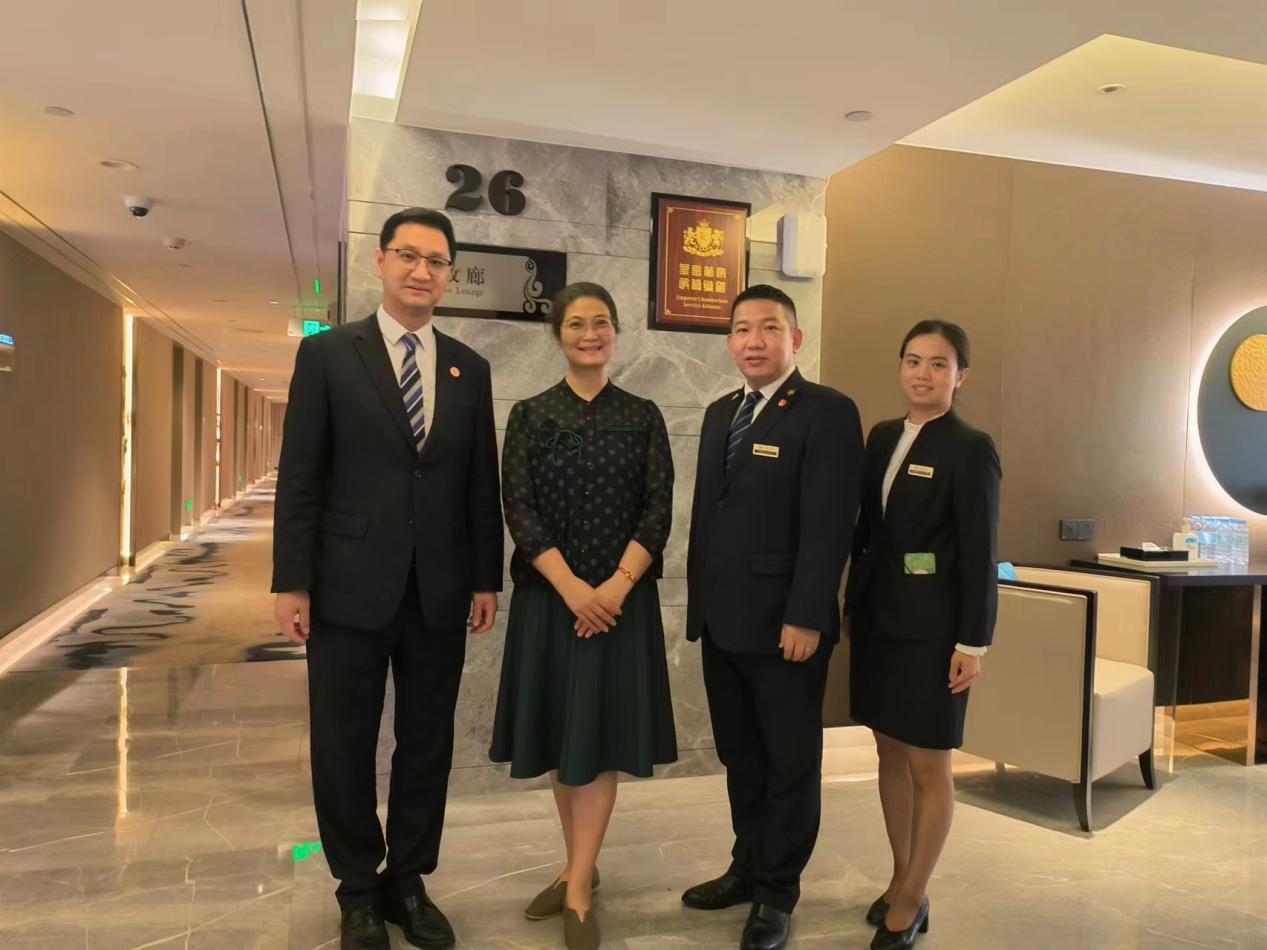 为进一步提高人才培养质量,深化产教融合、校企合作,促进毕业生高质量就业,落实学校访企拓岗促就业专项行动,5月31日,文化旅游学院谭金凤副院长赴白云宾馆走访调研。与白云宾馆房务总监肖华彬、前厅部副经理陈金亮、人力资源部培训师温琳琳等酒店一行深入探讨酒店业发展新趋势和人力资源新需求,并针对五星级商务酒店前厅部岗位的职业能力进行共同分析。